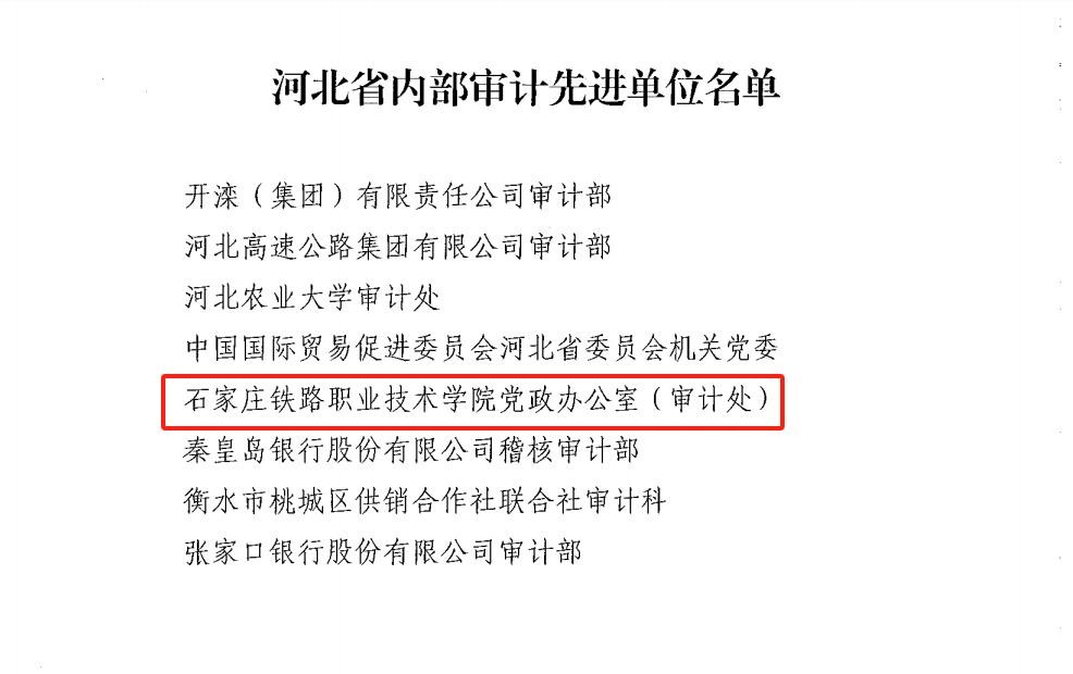 近日,我院党政办公室(审计处)被中共河北省委审计委员会评为2020至2022年“河北省内部审计先进单位”,为八个获奖单位中唯一一所高职院校。